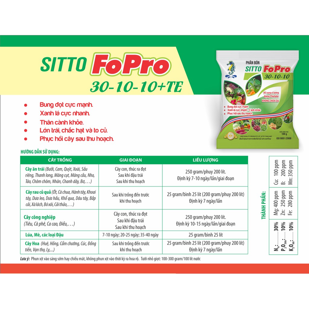 Giới thiệu Phân bón lá NPK hòa tan Sitto FoPro 30-10-10+TE gói 250g/500g