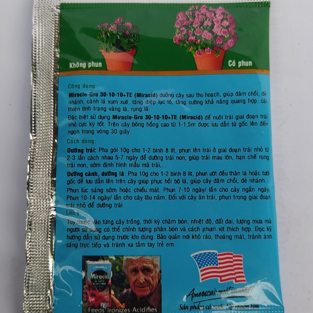 * Miracle - Gro 30-10-10+TE (Miracid) dưỡng cây sau thu hoạch, giúp đâm chồi đẻ nhánh, cành lá xum xuê, tăng diệp lục tố, tăng cường khả năng quan hợp, cải thiện tình hình vàng lá, rụng lá.