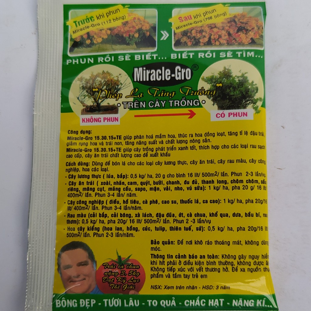 * Miracle Gro 15 - 30 - 15: Giúp cây trồng phát triển xanh tốt, làm cây cứng cáp, dẻo dai, mau ra hoa, tỷ lệ đậu trái cao.