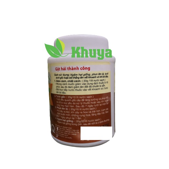 3. Phun lên lá: (20g/16 lít nước sạch) Khi cây ra đọt, khi cây ra hoa, và trái non, khi cây thiếu dinh dưỡng. Làm cây đâm tược mới, làm lớn lá, hoa nở đồng loạt, chống rụng hoa, tăng đậu trái, bổ sung vi lượng, làm dai cuống, hạn chế sự rụng trái non.