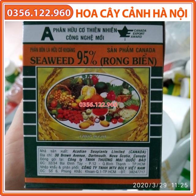 Phân bón rong biển SEAWEED - được sản xuất theo công nghệ mới của Canada.Thành phần: HC: 50%; N: 1,5%; P2O5: 3%; K2O: 20%; S: 1,5%; Mg: 0,45% B: 125ppm; Fe: 200ppm; Mn: 10ppm; Cu: 30ppm; Zn: 65ppm; Cytokinin: 600ppm; Auxin: 37ppm; Gibberellin: 21ppm, Axit Amin (Alanin; Arginin; Threonin; Cystin; Serin; Glycin; Histidin; Valin; Isoleucin; Leucin; Lysin; Prolin; Methionin; Phenylalanin; Tyrosin; Tryptophan; Glutamic amic Axit; Aspartic Axit; Mannitol; Laminarin; Alginic Axit): 5,39%; Độ ẩm: 3-5%