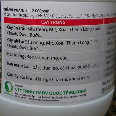 Và các phụ gia đặc biệt: N: 6%; P2O5hh: 25%; K2hhO: 9%; MgO: 2%; S: 8%; Zn: 750ppm
