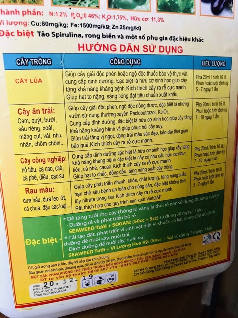-Phân bón lá SEAWEED tưới tăng lực cho cây trồng : rất thích hợp cho quy trình sản xuất VietGAP.