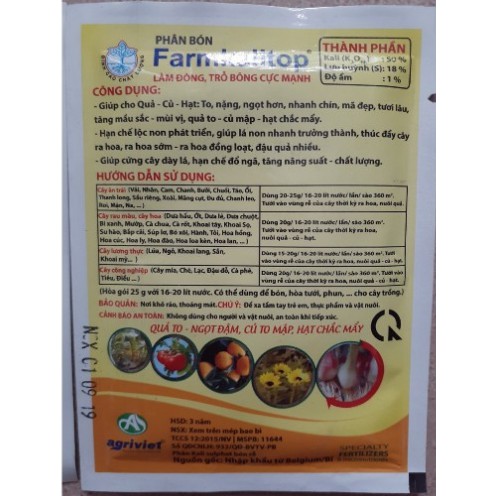 Phân bón nhập khẩu farmKalitop (siêu Kali)Thành phần: 50% K2Ohh, 18% S