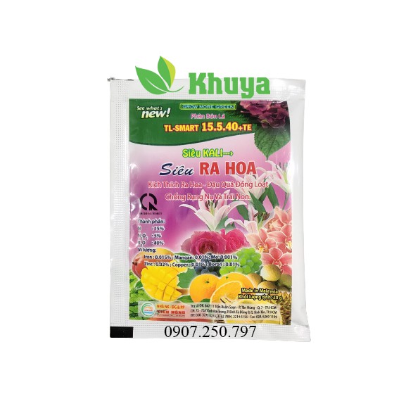 Phân bón lá Siêu Ra Hoa Kali TL Smart 15-5-40 20grKích thích ra hoa - Đậu quả đồng loạt - Chống rụng nụ - Chống rụng trái non