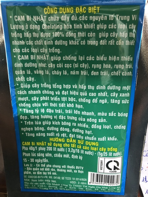 » CAM BI NHẬT 308 chứa đầy đủ các nguyên tố Trung Vi Lượng ở dạng Chelating hoá tinh khiết giúp các loại cây trồng hấp thụ được 100% đồng thời còn giúp cây hấp thụ nhanh các chất dinh dưỡng khác có trong đất rất cần thiết cho các loại cây trồng.