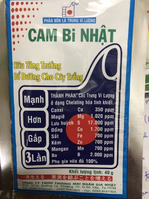 Phân bón lá trung vi lượng Cam Bi NhậtThành phần: