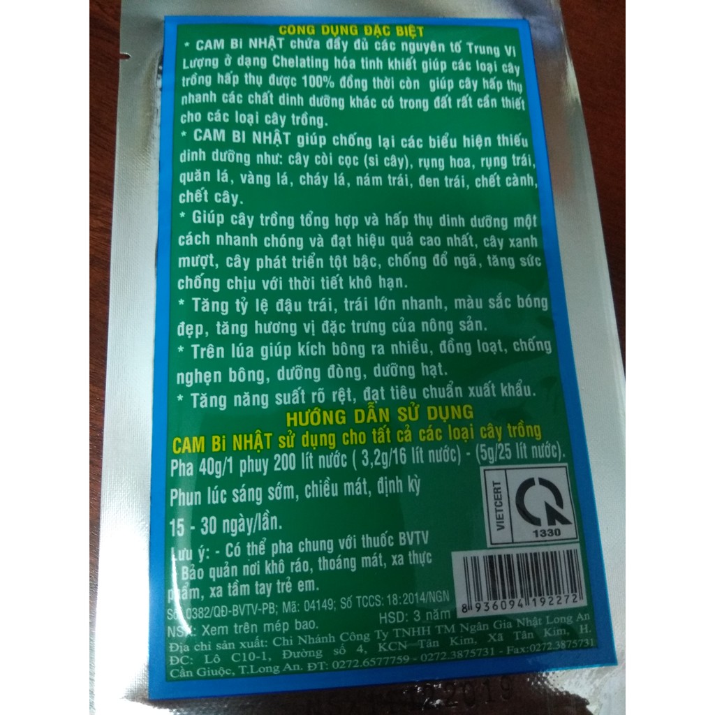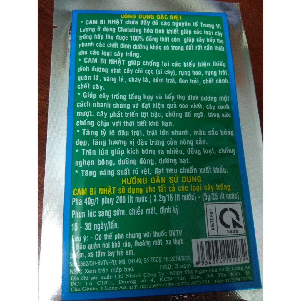 - CAM BI NHẬT chứa đầy đủ các nguyên tố trung Vi Lượng ở dạng Chelating hoá tinh khiết giúp các loại cây trồng hấp thụ được 100% đồng thời còn giúp cây hấp thụ nhanh các chất dinh dưỡng khác có trong đất rất cần thiết cho các loại cây trồng.