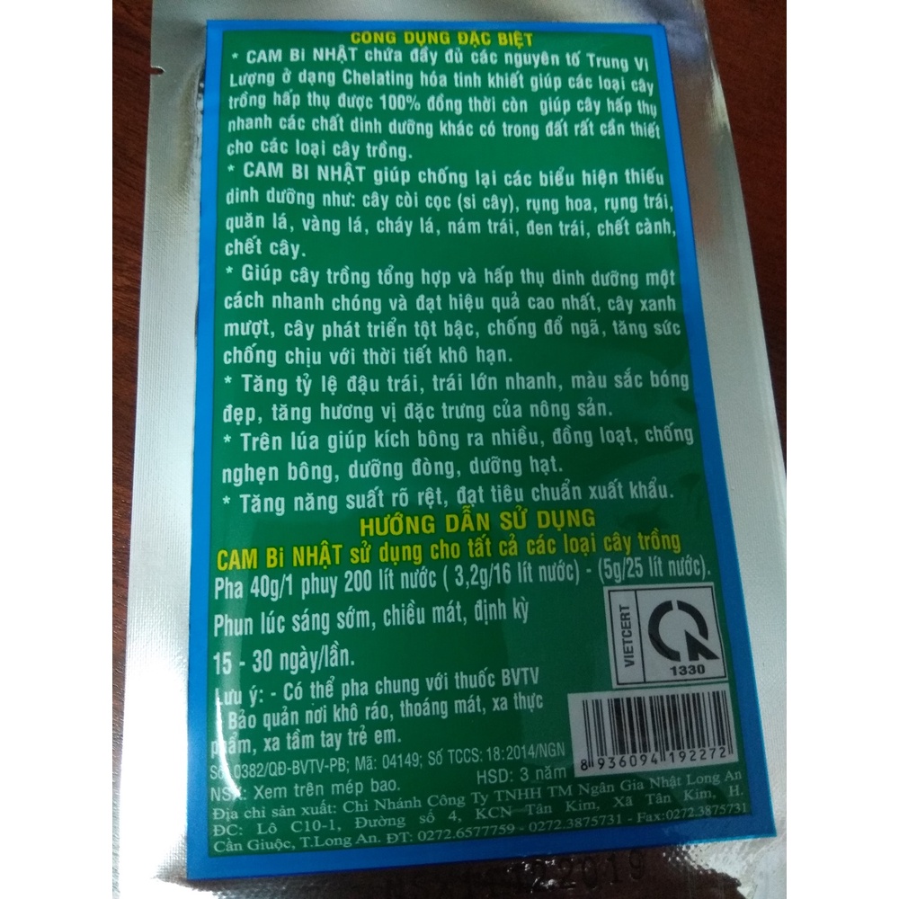 » CAM BI NHẬT 308 chứa đầy đủ các nguyên tố Trung Vi Lượng ở dạng Chelating hoá tinh khiết giúp các loại cây trồng hấp thụ được 100% đồng thời còn giúp cây hấp thụ nhanh các chất dinh dưỡng khác có trong đất rất cần thiết cho các loại cây trồng.