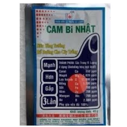 CAM BI NHẬT chứa đầy đủ các nguyên tố Trung Vi Lượng ở dạng Chelating hoá tinh khiết giúp các loại cây trồng hấp thụ được 100% đồng thời còn giúp cây hấp thụ nhanh các chất dinh dưỡng khác có trong đất rất cần thiết cho các loại cây trồng.» CAM BI NHẬT giúp chống lại các biểu hiện thiếu dinh dưỡng như:cây cói cọc (si cây ),rụng hoa,rụng trái,quăn lá,vàng lá,cháy lá,nám trái,đen trái,chết cành,chết cây.