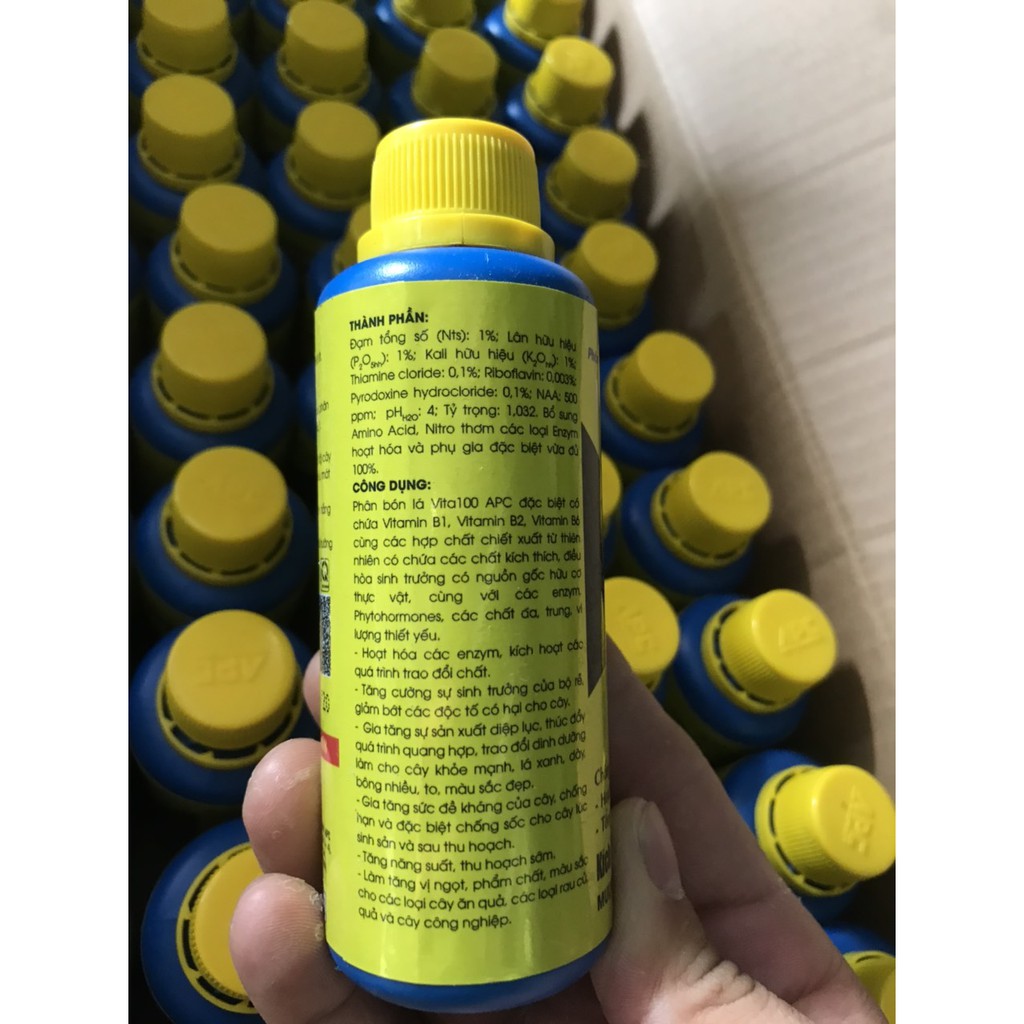 - Phân bón lá Vita100 APC đặc biệt có chứa Vitamin B1, Vitamin B2, Vitamin B6 cùng các hợp chất chiết xuất từ thiên nhiên có chứa các chất kích thích, điều hòa sinh trưởng có nguồn gốc hữu cơ thực vật, cùng với các enzym, Phytohormones, các chất đa, trung, vi lượng thiết yếu.