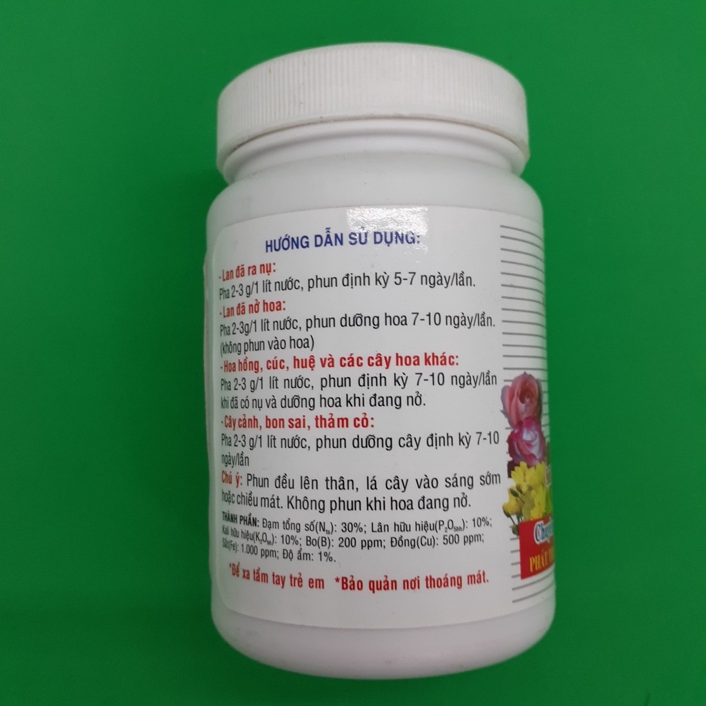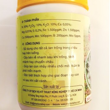 Thành phần: N: 30%; PO: 10%; KO: 10%; Ca: 0.05%; Mg: 0.1%; S: 0.02%; B: 0.02%, Fe: 0.1%; Zn: 0.05%; Cu: 0.05%.