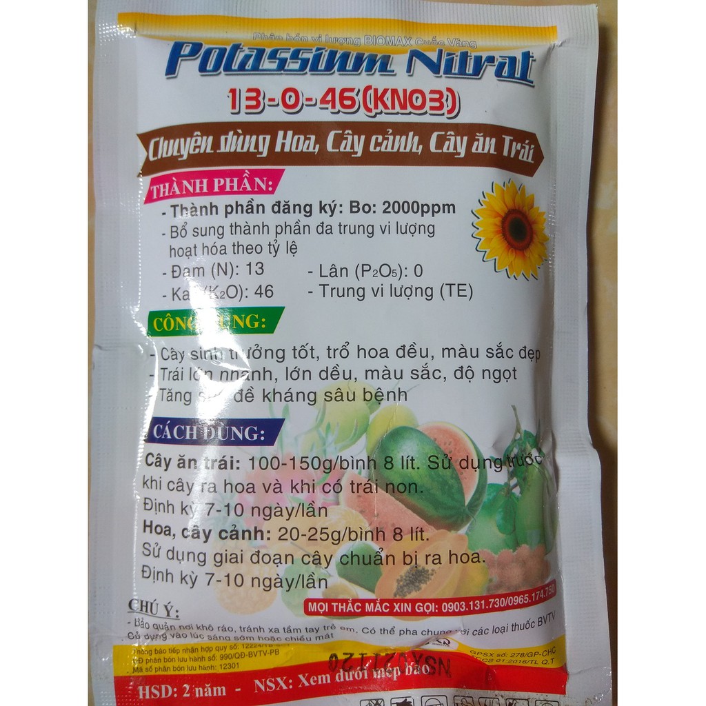 Bo : 2000 ppm, NPK : 13-0-46 %, trung vi lượng