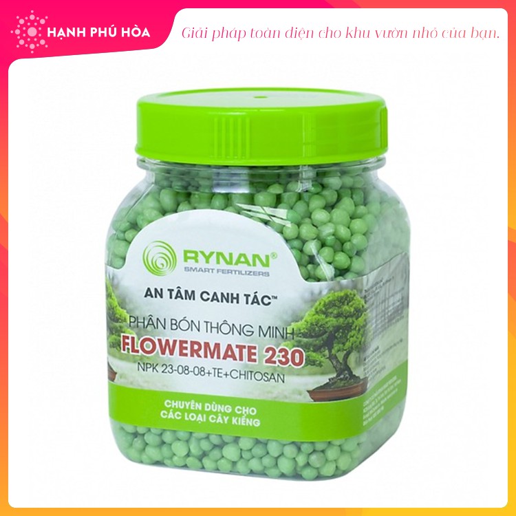 MÔ TẢ SẢN PHẨM- RYNAN® FLOWERMATE 230 là dòng sản phẩm phân bón thông minh tan chậm có kiểm soát chuyên dùng cho các loại kiểng lá, kiểng treo, bonsai, kiểng công trình. Thời gian cung cấp dưỡng chất lên đến 180 ngày. Giúp cây sinh trưởng khỏe mạnh, tăng sức đề kháng, hạn chế nấm bệnh, phát triển thân lá, giữ màu xanh cho cây.