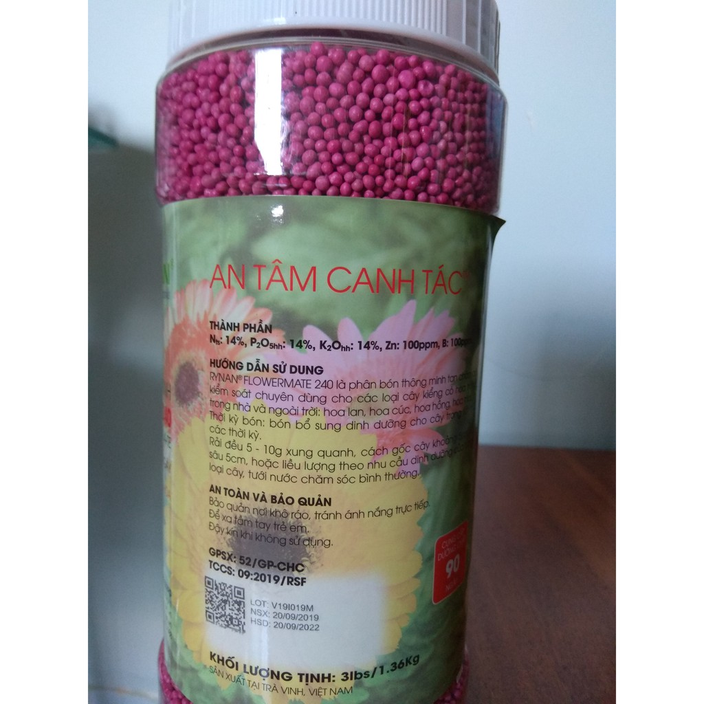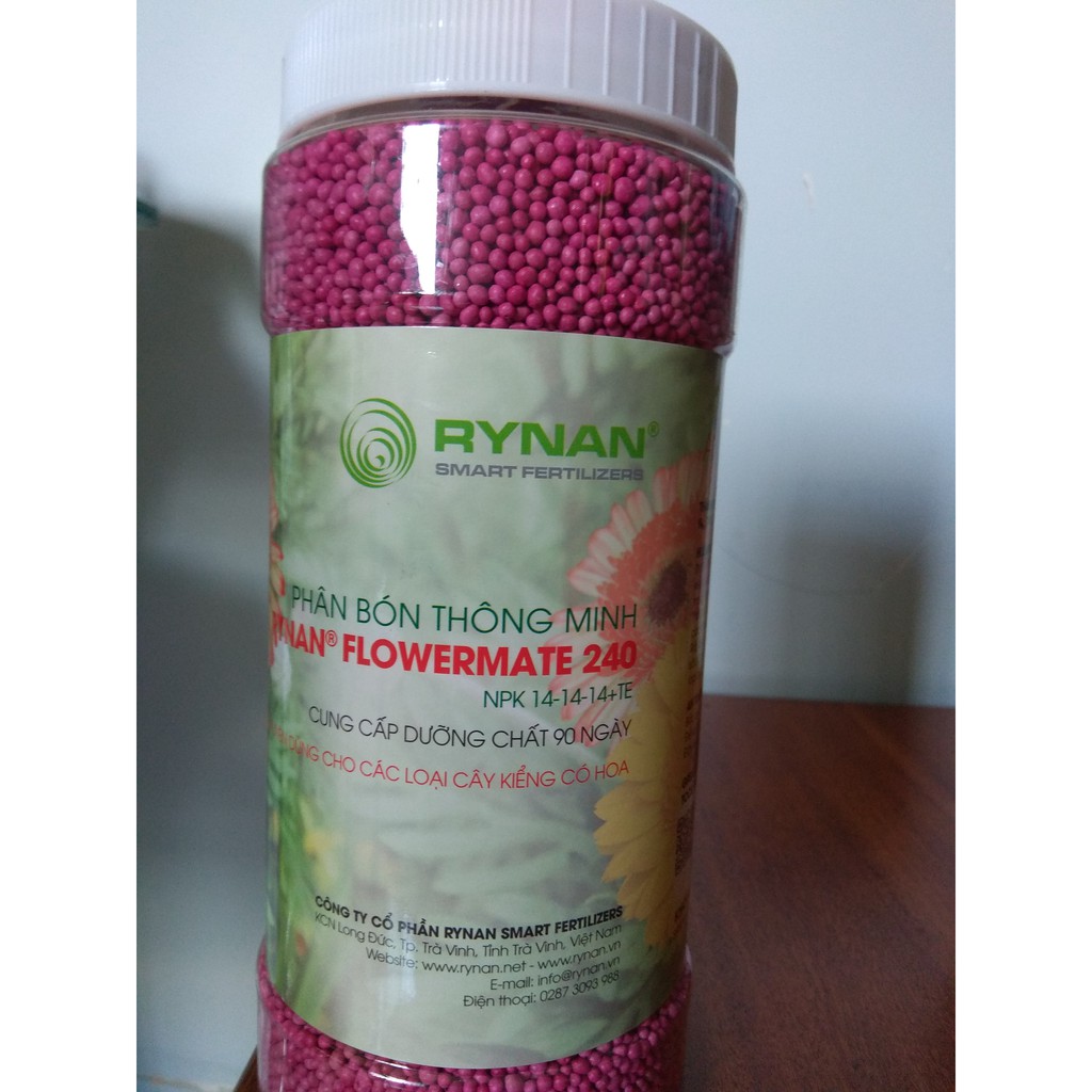 Phân bón rynan Flowermate 240 với tỷ lệ NPK 14-14-14 là phân bón thông minh tan chậm có kiểm soát chuyên dùng cho cây kiểng có hoa trồng trong nhà và ngoài trời như : hoa lan, hoa cúc, hoa hồng, hoa mai...Thời kỳ bón : bón bổ sung dinh dưỡng cho cây trong tất cả các thời kỳ