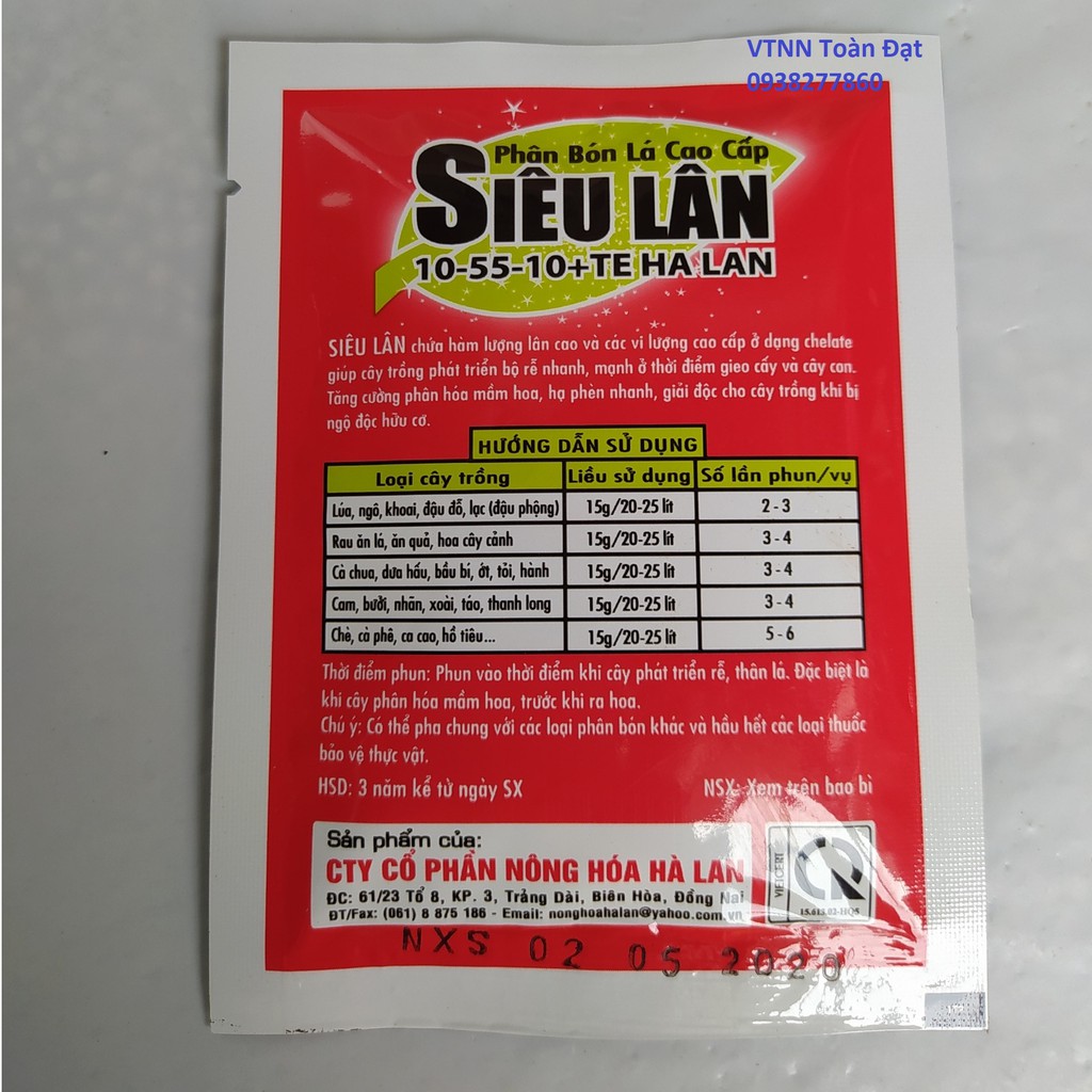 Phân Bón Lá Siêu Lân, Siêu lân đỏ 10-55-10+TE (gói 15g)Thành phần: