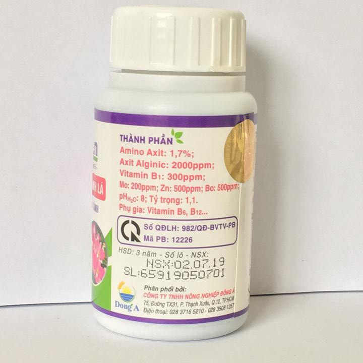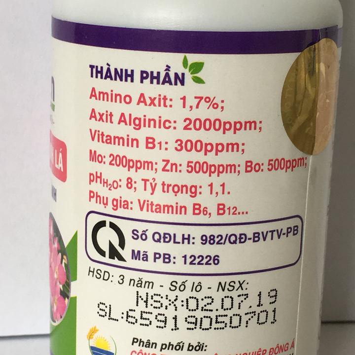Amino acids 1,7% ; Alginic Acid 2000ppm; Vitamin B1: 300ppm; Mo: 200ppm; Zn: 500ppm; Bo: 500 ppm; pHh2O: 8; Phụ gia Vitamin B6; B12