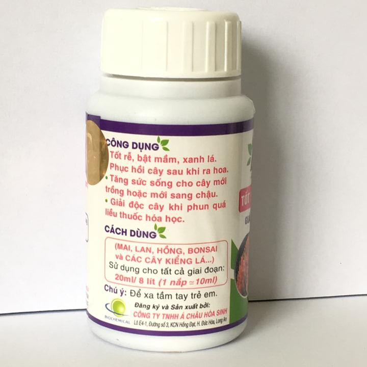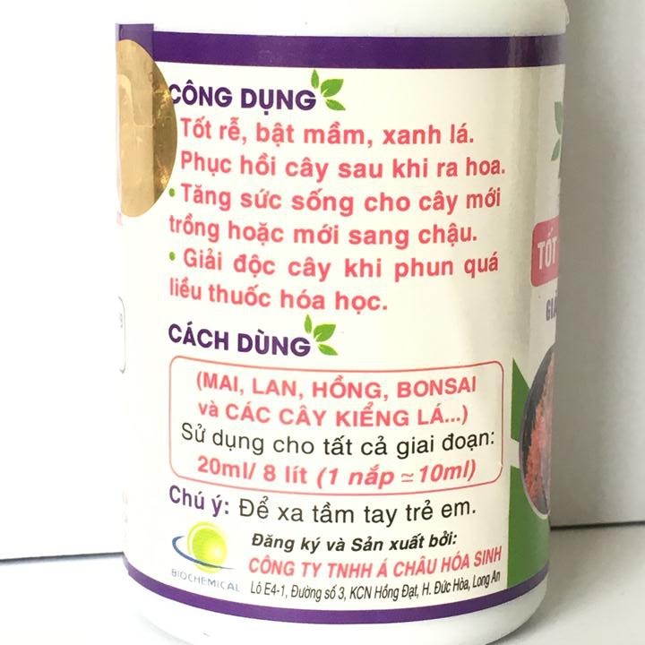 - Giải độc, chống sốc cây hoa; cây cảnh. Tốt rễ, bật mầm, xanh lá. Tăng sức sống cho cây mới trồng hoặc mới sang chậu. Giải độc khi cây bị phun quá liều thuốc hoá học