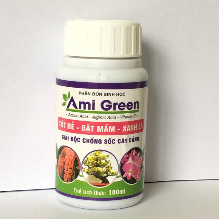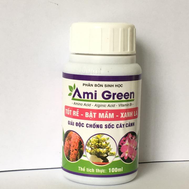 Giới thiệu Phân bón sinh học AMI GREEN giải độc cây trồng. Tốt rễ, bật mầm, xanh lá chai 100ml.