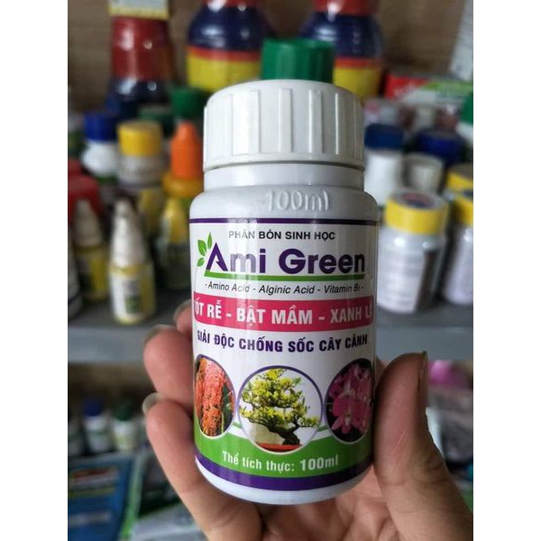 Phân bón sinh học AMI GREEN giải độc cây trồng Tốt rễ, bật mầm, xanh lá chai 100ml