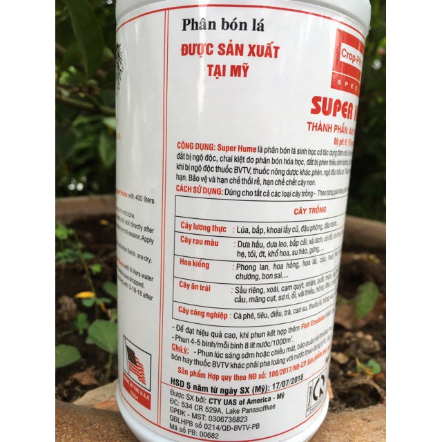 Phân bón lá Super Hume được sản xuất tại Mỹ bởi Cty UAS of America- Mỹ,Sản phẩm phù hợp theo tiêu chuẩn GAPĐể đạt hiệu quả cao nhất khi phun kết hợp thêm Fish Emulsion hoặc Super 10-8-8 tùy theo thời kỳ phát triển của cây trồng.