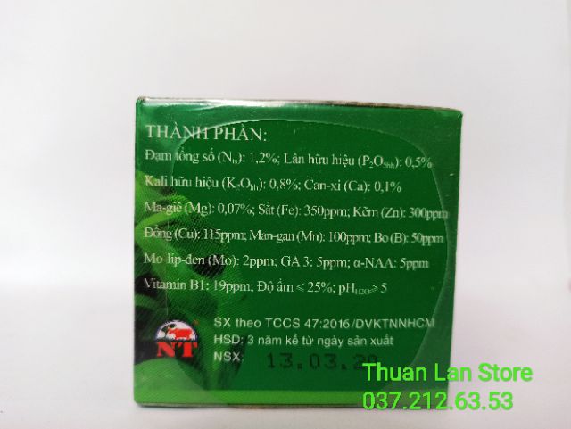 N-P2O5-K2O: 1,5-1-1%; Ca: 0,5%; Mg: 0,07%; Vitamin B1: 35ppm;α-NAA: 5ppm; Ga3: 5ppm; Fe: 350ppm; Zn: 350ppm; Cu: 140ppm; Mn: 100ppm; B:50ppm; Co: 2ppm; Mo: 2ppm. Ẩm độ 25%
