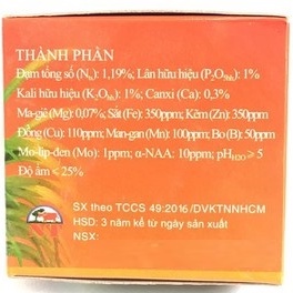 Đạm tổng số (Nts) 1,19%; Lân hữu hiệu (P2O5hh): 1%, Kali Hữu Hiệu (K2Ohh): 1%; Canxi (CA): 0,3%; Mg: 0,07%; α-NAA: 10ppm; Fe: 350ppm; Zn: 350ppm; Cu: 115ppm; Mn: 100ppm; B:50ppm; Mo: 1ppm. Ẩm độ 25%