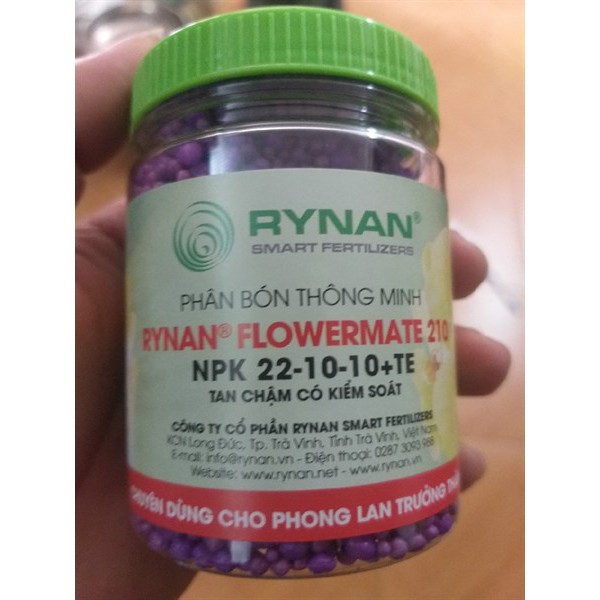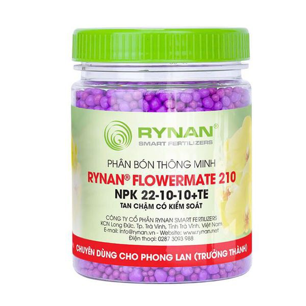Phân Bón Rynan Flowermate 210 là dòng phân bón thông minh, sản phẩm được sản xuất theo công nghệ tiên tiến với lớp màng polymer bao bọc bên ngoài có khả năng kiểm soát và điều tiết việc giải phóng dinh dưỡng một cách hiệu quả.Phân bón Rynan 210 chứa hàm lượng khoáng NPK lần lượt là 21%, 10%, 10% được dùng cho lan trong giai đoạn trưởng thành và giai đoạn phục hồi cây trồng sau ra hoa.