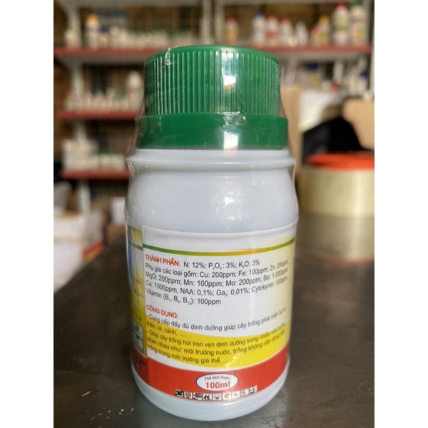 Thành phần ; đạm 12% lân 3% kali 3% phụ gia gồm các loại Cu , Fe, Zn, Mgo, Mn , Mo, Bo, Ca, Naa, Ga3, cytokynin, vitamin B1-B6-B 12Dung tích ; chai 100ml