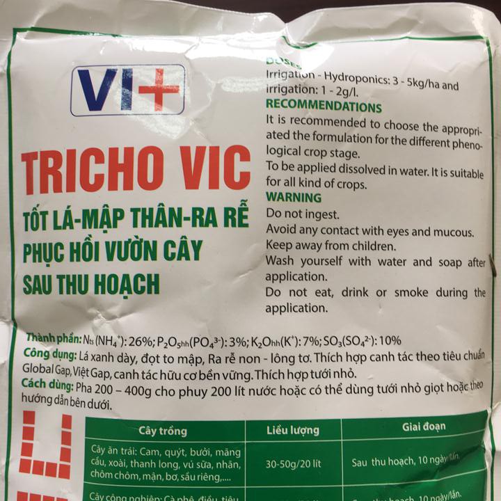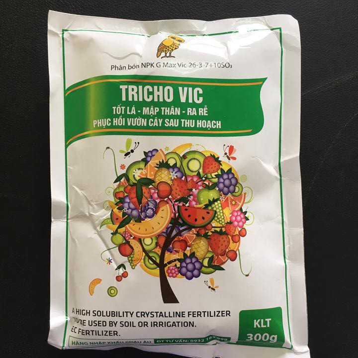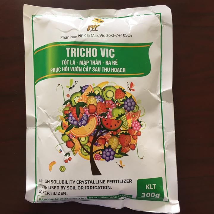 Phân bón Tricho Vic G Max Vic 26-3-7+ 10SO3 Gibberelin MaxVic gói 300g xuất xứ Tây Ban Nha giúp cây mập thân, tốt lá, ra rễ phục hồi vườn cây sau thu hoạchQui cách sản phẩm: