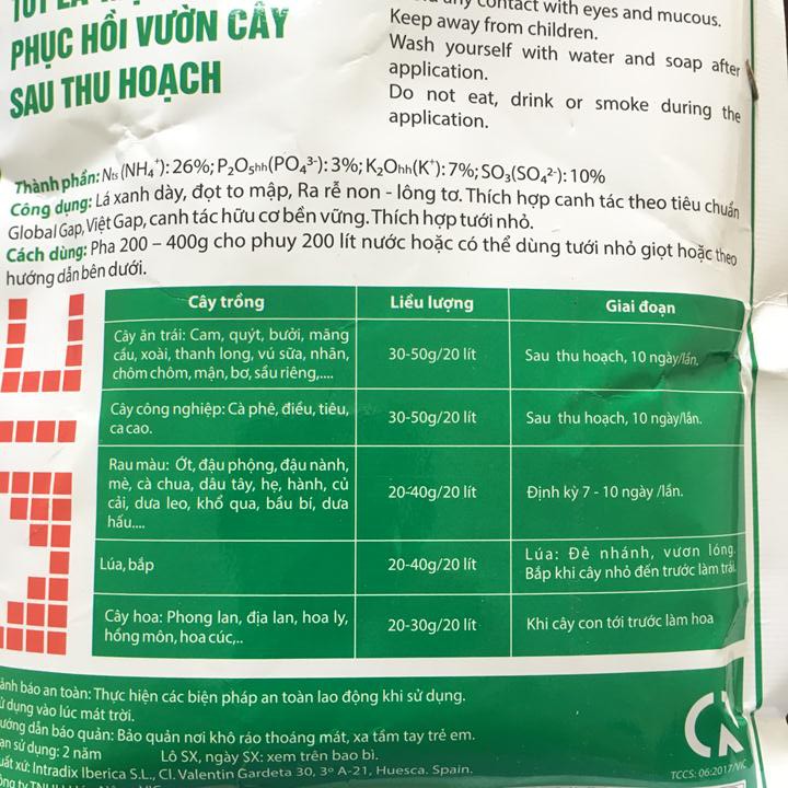 Công dụng: giúp cây mập thân, tốt lá, ra rễ phục hồi vườn cây sau thu hoạch. Thích hợp cho canh tác theo tiêu chuẩn Global Gap, Viet Gap, canh tác hữu cơ bền vững.
