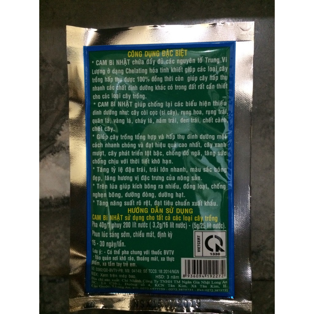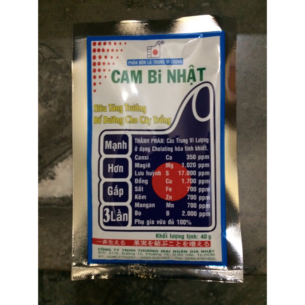 Phân bón bổ sung trung vi lượng Cam bi nhật 308 siêu tăng trưởng cho cây trồng gói 40gThành phần: Các trung vi lượng ở dạng Chelating hóa tinh khiết. Boron B 2.000 ppm Mangan Mn 700 ppm Magie MgO 1.700 ppm Kẽm Zn 700 ppm Sắt Fe 700 ppm Đồng Cu 1.700 ppm Canxi CaO 500 ppm Lưu huỳnh S 17.000 ppm