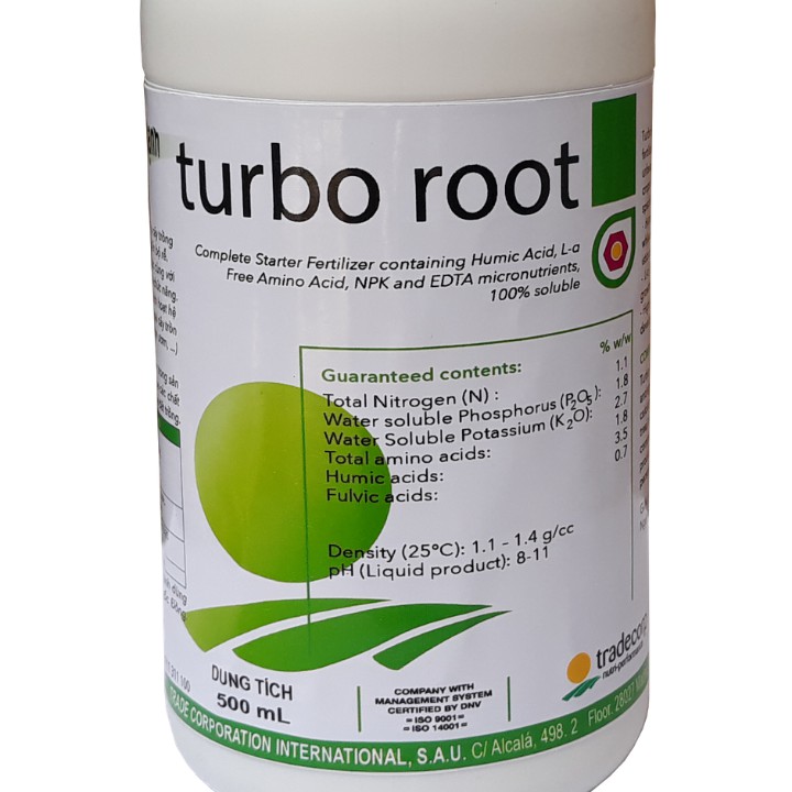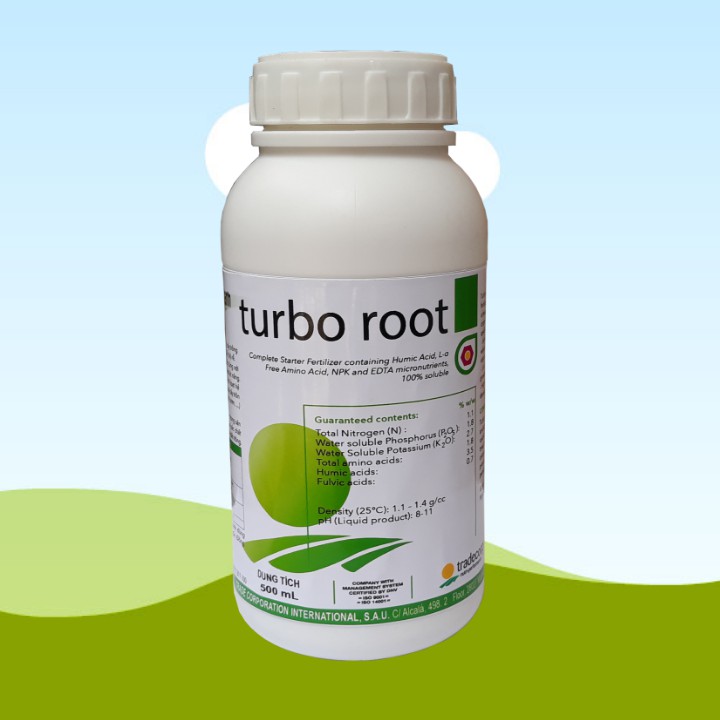 Phân bón ra rễ Turbo Root bao gồm các thành phần hữu cơ như amino axit, humic axit, fulvic axit, vi lượng hữu cơ giúp cây trồng hấp thụ nhanh, kích thích bộ rễ phát triển mạnh, cải tạo hệ vi sinh vật trong đất, nâng độ pH, bổ sung hữu cơ cho đất.THÔNG TIN SẢN PHẨM