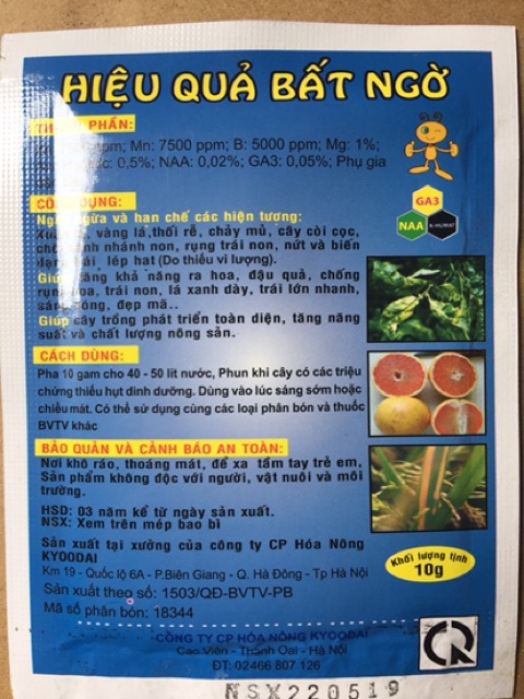 Dùng gói 10gr cho 16-25 lít nước, sử dụng khi cây có các triệu chứng thiếu hụt dinh dưỡng.