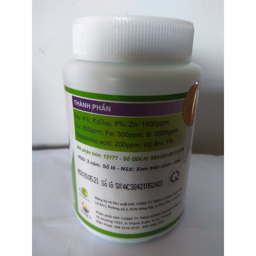 N : 4% , K2O : 8% , Zn : 1800 ppm, Cu : 800 ppm , Fe : 300 ppm, B : 2000 ppm , Gibberellic acid : 200 ppm, độ ẩm : 1%