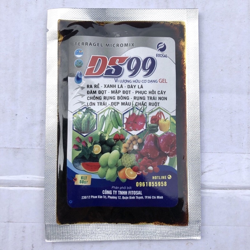 Phân Bón Vi lượng hữu cơ dạng GEL DS99Phân Bón Vi lượng hữu cơ dạng GEL DS99: chứa đầy đủ các nguyên tố Vi Lượng ở dạng Chelating hoá tinh khiết giúp các loại cây trồng hấp thụ được 100% đồng thời còn giúp cây hấp thụ nhanh các chất dinh dưỡng khác có trong đất rất cần thiết cho các loại cây trồng.