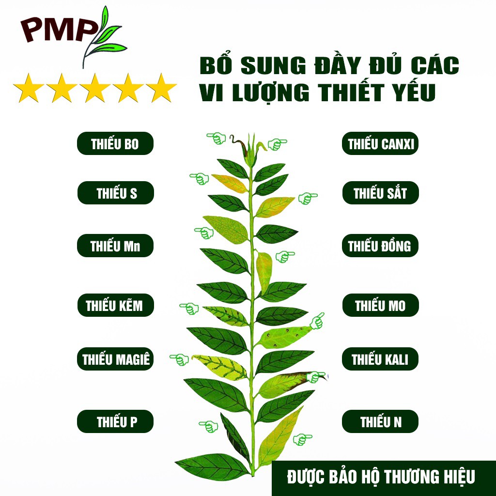 - Phân bón vi lượng PMP giúp cung cấp đầy đủ tất cả các nguyên tố trung và vi lượng cho cây trồng bao gồm: Ca, S, Fe, Cu, Zn, B, Mn, Mg, N, K, P...