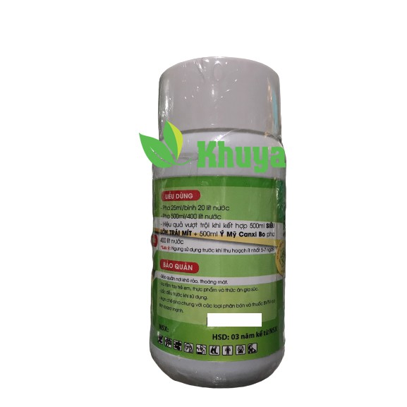 Hướng dẫn sử dụng: Pha 500ml/ 400 lít nước. Hiệu quả vượt trội khi kết hợp 500ml Siêu Lớn trái mít + 500 ml Ý Mỹ Canxi Bo pha 400 lit nước (Ngưng sử dụng trước khi thu hoạch ít nhất 5-7 ngày)