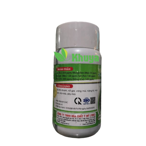 Thành phần: Bo (B): 2.500 ppm; Molypđen (Mo): 55 ppm; Mangan (Mn): 120 ppm; Sắt (Fe): 130 ppm; Kẽm (Zn): 200 ppm; Đồng (Cu): 140 ppm