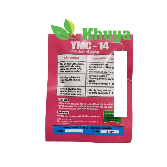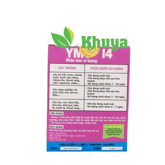 Phân bón vi lượng Viên sủi YMC-14 Phì trái Lớn trái Chống nứt trái Tẩy trái 7grThành phần: N: 1%, P2O5: 2%, K2O: 3%, B: 175 ppm, Mo: 50ppm, B: 175ppm, Mn: 120ppm, Fe: 130ppm, Cu: 140ppm, Zn: 150ppm, Mg: 60 ppm và các phụ gia đặc biệt giúp trái lớn nhanh, lên màu cực đẹp