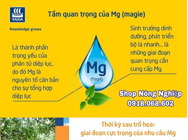-Bổ sung Magie giúp cây tổng hợp nhiều diệp lục tố để cây quang hợp tốt, giúp bộ lá xanh dày, mau thành thục nhất là trong giai đoạn đang phát triển thân lá, đang nuôi trái và sau thu hoạch.