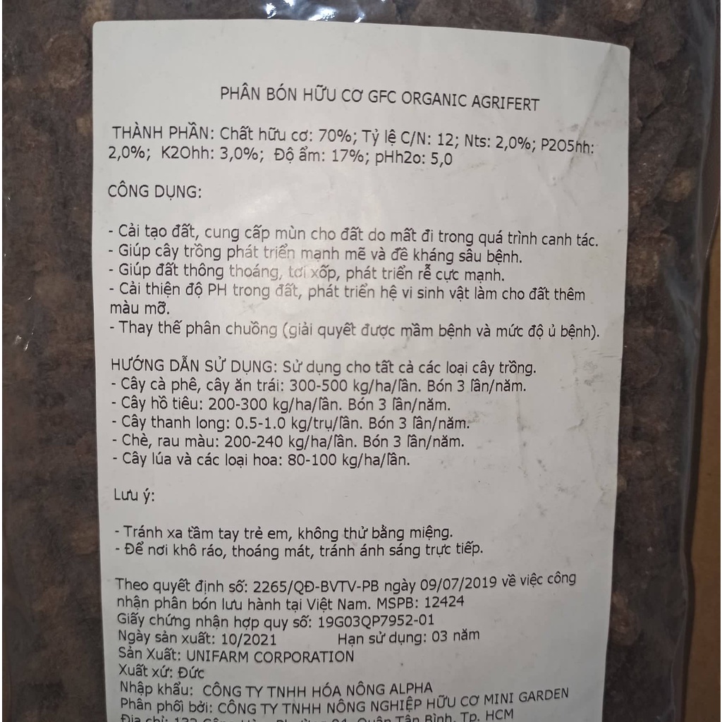 PHÂN BÓN HỮU CƠ GFC ORGANIC AGRIFERTTHÀNH PHẦN: Chất hữu cơ: 70%; Tỷ lệ C/N: 12; Nts: 2,0%; P2O5hh: 2,0%; K2Ohh: 3,0%; Độ ẩm: 17%; phh2o: 5,0