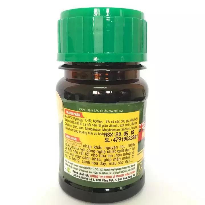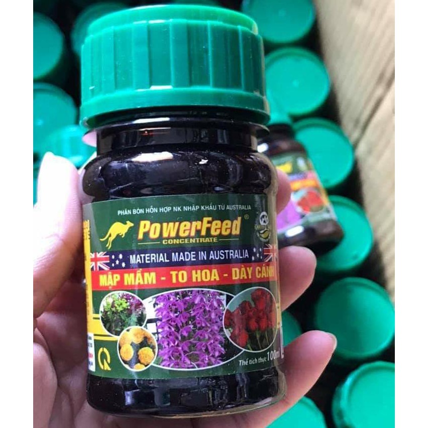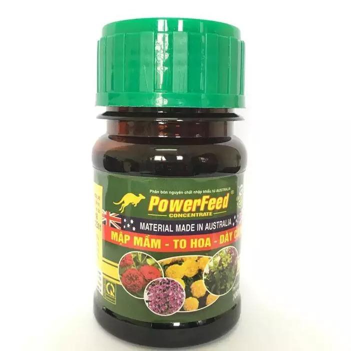 Phân đạm cá Powerfeed chai 100ml, nguyên liệu nhập khẩu Úc, chiết xuất từ cá Hồi/Qui cách sản phẩm: Chai 100ml.Công dụng: Nguyên liệu nhập khẩu 100% từ Australia với công nghệ chiết xuất đạm từ cá hồi nên rất tốt cho hoa lan, hoa hồng và các loại cây cảnh. Giúp cây có mầm mập, nọ to, to bông, cánh hoa dày, màu sắc đẹp.Cách dùng: Pha 1ml với 1 Lít nước. Phun toàn cây 5-7 ngày 1 lần từ khi cây nhỏ đến khi thu hoạchPhân đạm cá Powerfeed chai 100ml, nguyên liệu nhập khẩu Úc, chiết xuất từ cá Hồi/Qui cách sản phẩm: Chai 100ml.Công dụng: Nguyên liệu nhập khẩu 100% từ Australia với công nghệ chiết xuất đạm từ cá hồi nên rất tốt cho hoa lan, hoa hồng và các loại cây cảnh. Giúp cây có mầm mập, nọ to, to bông, cánh hoa dày, màu sắc đẹp.Cách dùng: Pha 15ml với 16 Lít nước. Phun 5-7 ngày 1 lần từ khi cây nhỏ đến khi thu hoạch.Lưu ý: pha chung với Seasol để có hiệu quả cao nhất.