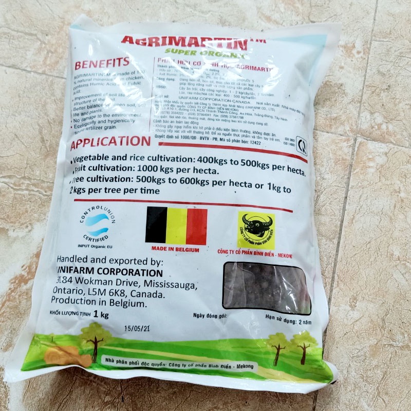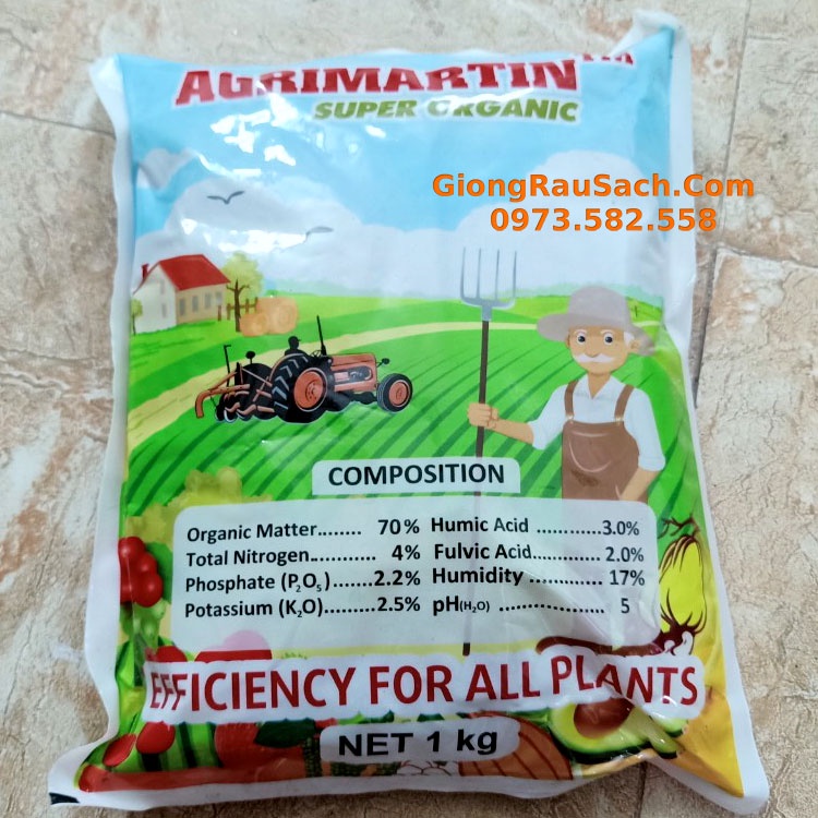 - Thành phần: Hữu cơ 72%, Axit humic 1%, Nts 3,5%, P2O5hh 2,5%, K2Ohh 2,5% CaO 3% MgO 0,2% TE( B, Cu, Zn)