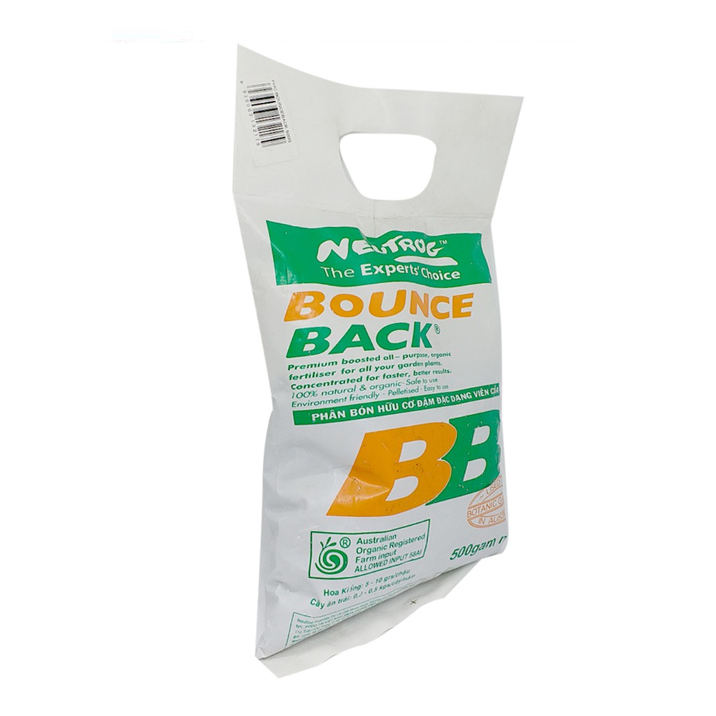 Phân bón hữu cơ Bounce Back Neutrog 500g là loại phân bón hữu cơ đậm đặc được sản xuất tại Úc theo quy trình công nghệ tiên tiến, chất lượng cao. Sản phẩm được cấp giấy chứng nhận chất lượng của Hội Nông Dân Sinh Học Úc (BFA), được Bộ Nông nghiệp và Phát triển nông thôn Việt Nam cho phép sử dụng rộng rãi trong nông nghiệp. - Phân bón hữu cơ Bounce Back dùng được cho một số loại hoa màu, hoa các loại, cây công nghiệp, cây ăn quả các loại, cây lương thực, mía, bãi cỏ, sân golf, công viên. - Sản phẩm không mang mầm bệnh, không gây cháy lá và không gây ô nhiễm môi trường. Phân bón tan chậm trong đất nhờ thêm chất Zeolite. Khả năng kích thích hệ vi sinh vật, trùn đất và làm cho đất thông thoáng giúp cây trồng phát triển mạnh, phòng chống các loại sâu bệnh. Sản xuất tại Úc do Công ty Neutrog Australia Pty. Ltd, 288 Mines Rd., Kanmantoo, South Australia 5252