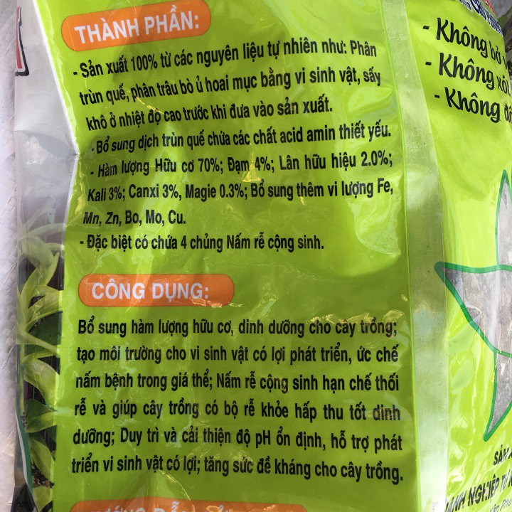 Hàm lượng hữu cơ 70%; đạm 4%; Lân hữu hiệu: 2%; Kali: 3%; Canxi: 3%; Magie 0.3%; Bổ sung thêm vi lượng Fe. Mn; Zn: Bo: Cu: Mo.