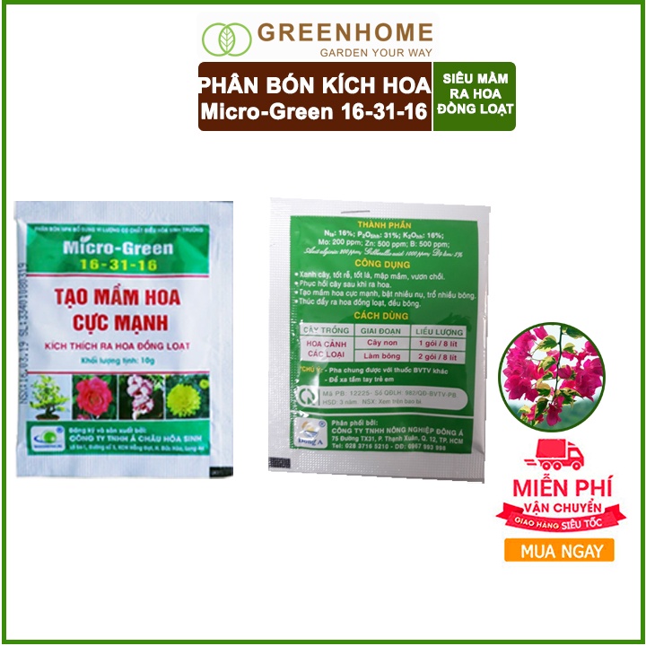 Nhà cửa & Đời sống > Làm vườn > Phân bón || Phân kích ra hoa, Micro Green 16-31-16, gói 10gr, tạo mầm hoa cực mạnh, thúc đẩy ra hoa đồng loạt |GreenhomeCòn hàng