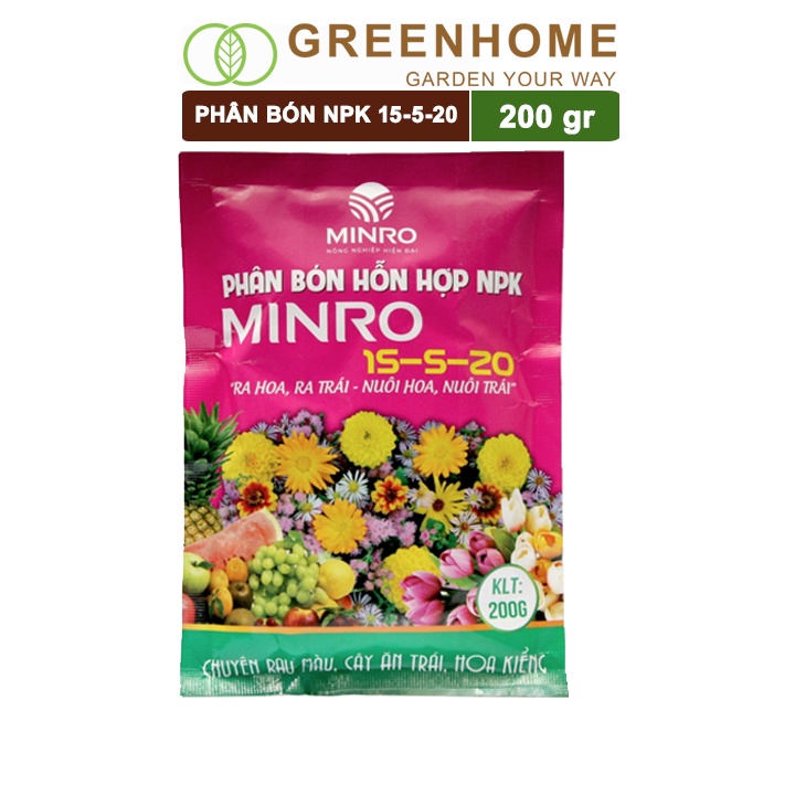 Giới thiệu Phân NPK 15-5-20 Minro, bao 200gr, phân bón kích ra hoa, đậu trái, nuôi hoa, nuôi trái |Greenhome