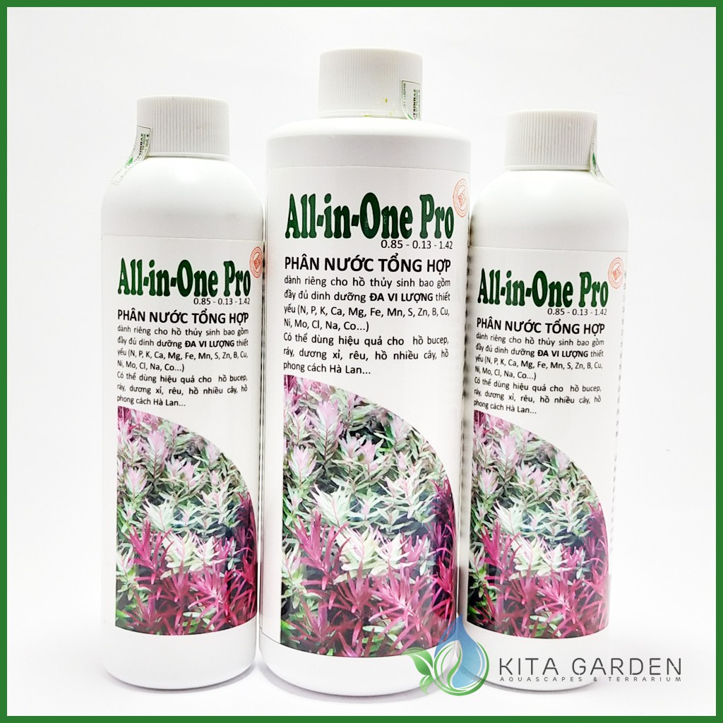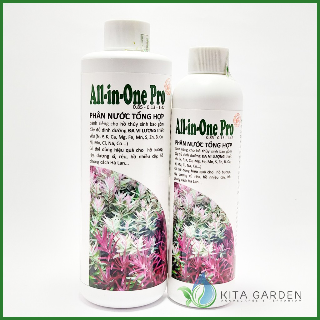 PHÂN NƯỚC TỔNG HỢP ĐA VI LƯỢNG PTV ALL IN ONE PRO là phân nước đậm đặc, chuyên dụng cho hồ thủy sinh nước ngọt, cung cấp đầy đủ chất đa vi lượng thiết yếu cho cây thủy sinh (Nitrogen, Phosphorus, Potassium, Mg, Fe, Mn, Zn, Bo, Co...).PTV All In One Pro có thể dùng tốt cho hồ cây cắt cắm, hồ phong cách Hà Lan, hồ bucep, nana, dương xỉ, rêu... Rất tiện dụng và dễ dàng sử dụng.