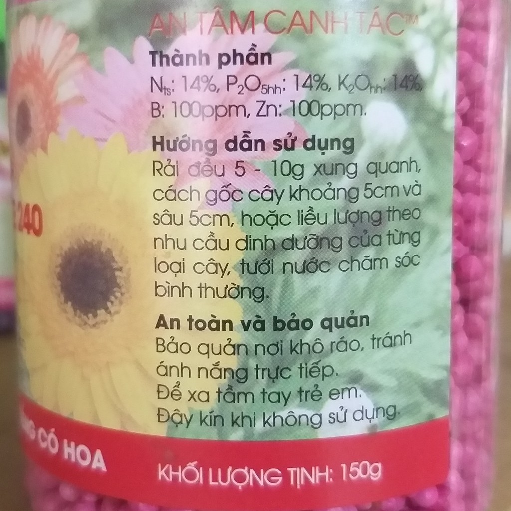 Thành Phần:Đạm ts: 14%, Lân: 14%, Kali: 14%, TE (Zn, B): 100 ppm.